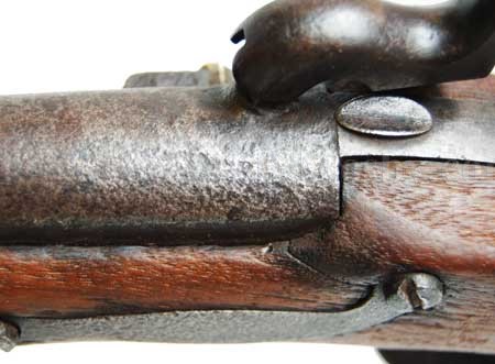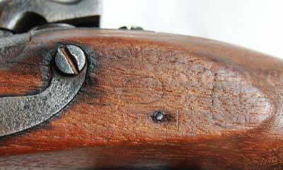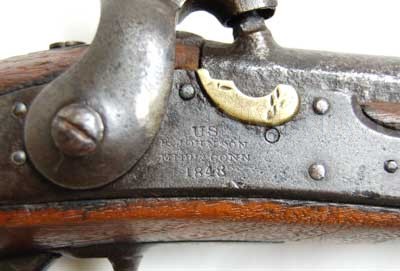 This example bears Johnson's mark; "US/ R. Johnson / Middn Conn / 1843" on the lockplate in front of the hammer. Stamped in small letters on the upper barrel at the breech are "US / P / RH” but barely decipherable due to use. The inspector's cartouche is clearly visible on the flat portion of the stock opposite the hammer. It is fully functional with clean bore.