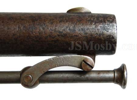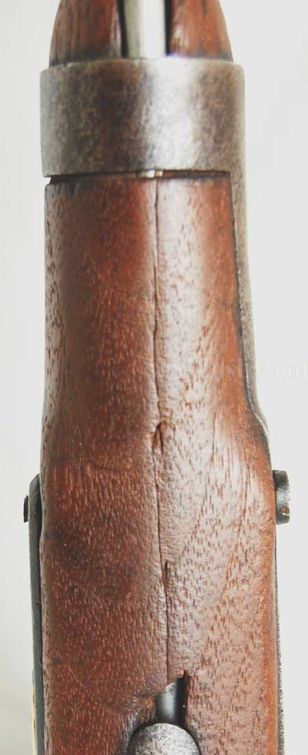 There is a thin, vertical crack on the stock below the barrel and a small chip near the base of the ramrod channel, but otherwise good condition. The ramrod is the steel swivel type with button head. All original parts. The mottled barrel shows pitting conducive to extensive use. This pistol "saw the elephant" in American service yet survived in working condition.